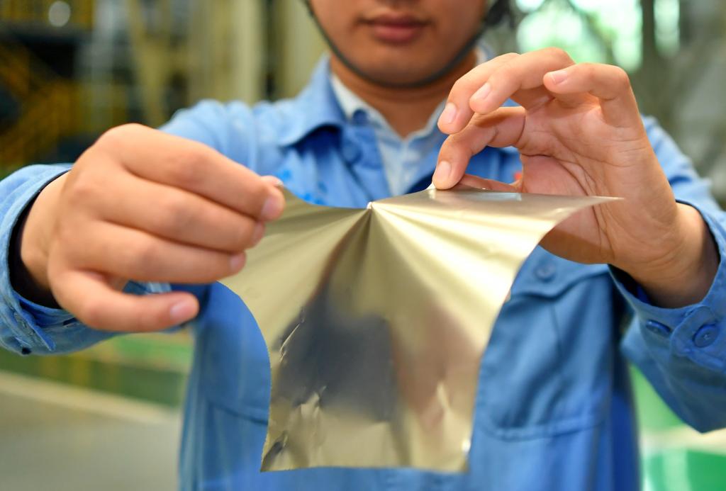 ??在位于山西的太鋼集團(tuán),員工展示用手撕開0.02毫米厚的超薄帶狀不銹鋼(2019年5月24日攝)。新華社記者 曹陽 攝