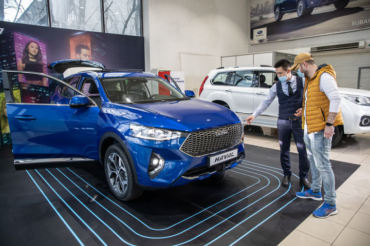 ??2021年4月1日,銷(xiāo)售人員在哈薩克斯坦阿拉木圖市經(jīng)銷(xiāo)商店向消費(fèi)者介紹哈弗汽車(chē)。新華社發(fā)(阿斯塔納汽車(chē)公司供圖)
