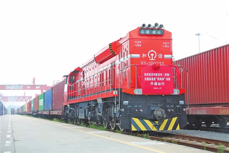 這趟班列踏上的是一條新征程,標(biāo)志著中歐班列(鄭州)南通道“跨兩海”線路開通運(yùn)行。