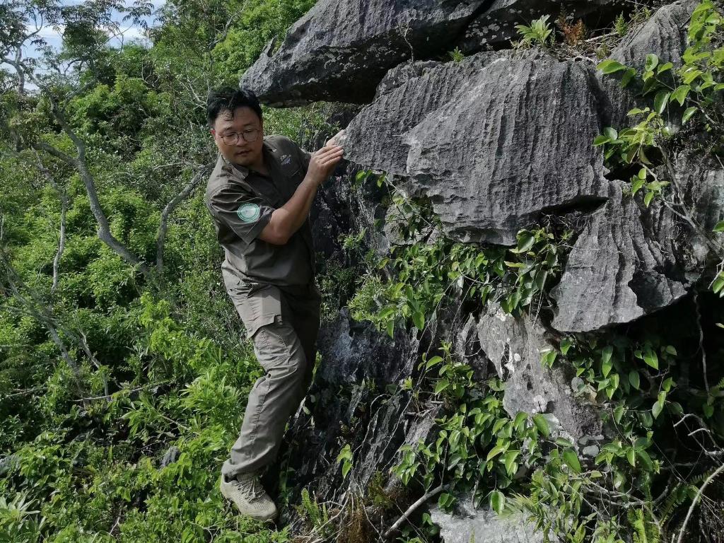 齊旭明在熱帶雨林中監(jiān)測海南長臂猿活動。(受訪者供圖)