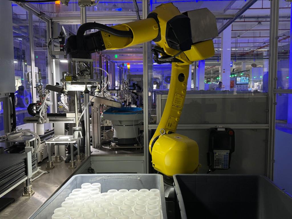 ??南安一家衛(wèi)浴企業(yè)生產(chǎn)線上,機(jī)械臂正在抓取過濾器零件。新華社記者 龐夢霞 攝