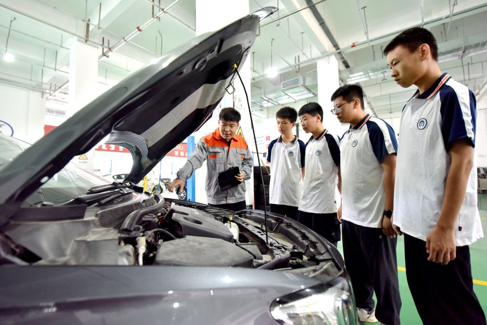 ??2024年6月7日,河北省邢臺(tái)市威縣職業(yè)技術(shù)教育中心教師在指導(dǎo)學(xué)生學(xué)習(xí)汽車(chē)維修技術(shù)。新華社記者 王曉 攝