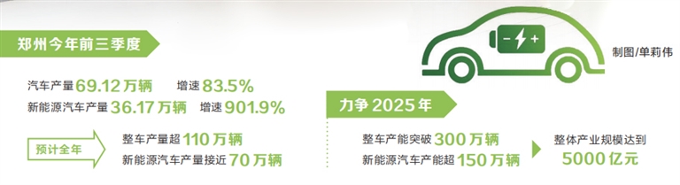 “今年前三季度,鄭州汽車產(chǎn)量69.12萬輛、增速83.5%,新能源汽車產(chǎn)量36.17萬輛、增速901.9%。預計全年整車產(chǎn)量超110萬輛,新能源汽車產(chǎn)量接近70萬輛?!编嵵菔姓嚓P負責人表示,鄭州正在加快建設全國重要的新能源及智能網(wǎng)聯(lián)汽車研發(fā)和生產(chǎn)基地,力爭2025年整車產(chǎn)能突破300萬輛、新能源汽車產(chǎn)能超150萬輛,整體產(chǎn)業(yè)規(guī)模達到5000億元。