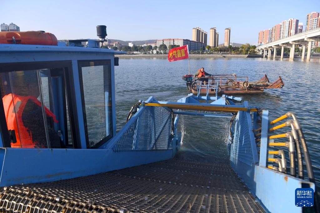 ??11月27日,淅川縣清漂隊(duì)工作人員在丹江口水庫宋崗碼頭附近進(jìn)行清漂作業(yè)。