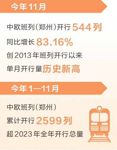 12月2日,記者獲悉,今年11月,中豫港務(wù)集團(tuán)鄭州陸港公司開(kāi)行中歐班列(鄭州)544列,同比增長(zhǎng)83.16%,創(chuàng)2013年班列開(kāi)行以來(lái)單月開(kāi)行量歷史新高。中歐班列(鄭州)今年1—11月累計(jì)開(kāi)行2599列,超2023年全年開(kāi)行總量。