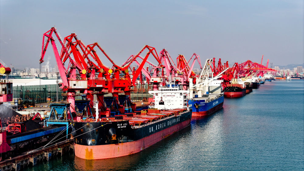 ??在山東港口日照港煤炭泊位,貨輪停泊卸煤(2024年12月4日攝,無人機(jī)照片)。新華社記者 郭緒雷 攝