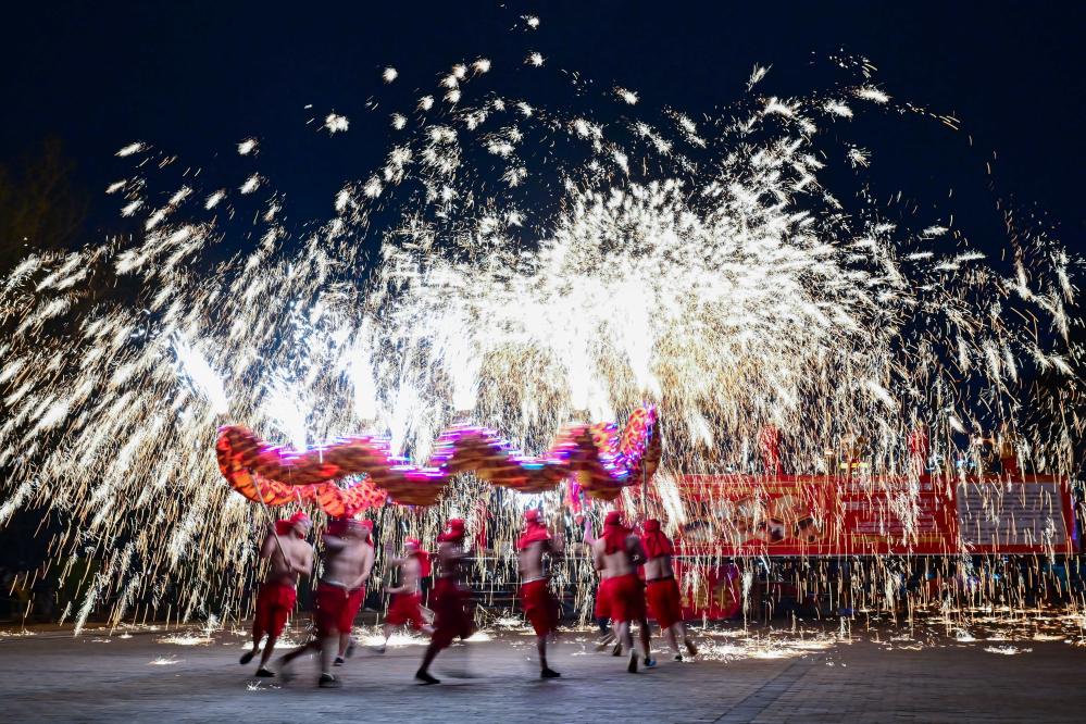 ??民間藝人在河南省洛陽市2024隋唐河洛文化廟會(huì)上表演打鐵花(2024年2月14日攝)。新華社發(fā)(李衛(wèi)超攝)